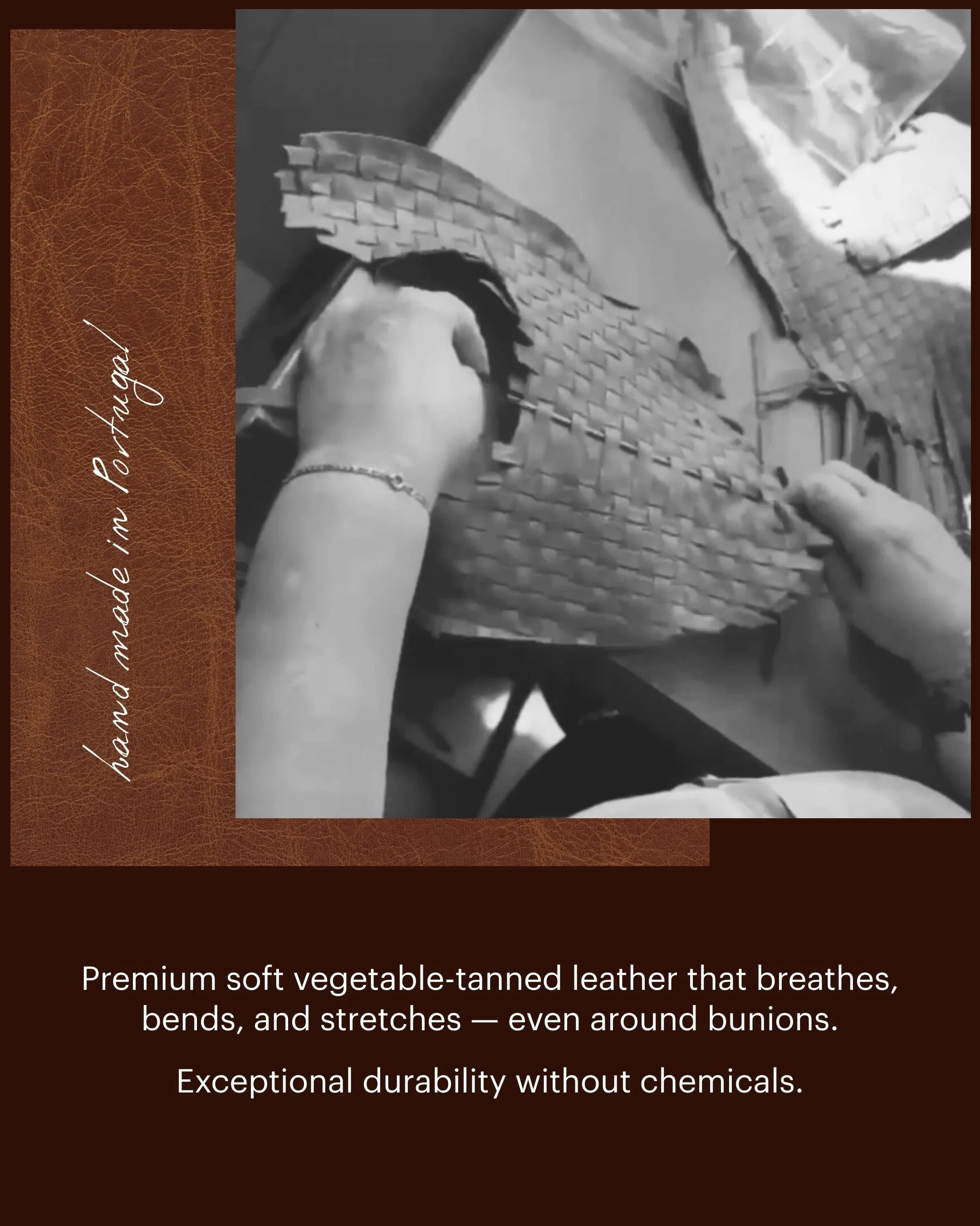 Upper: Portuguese vegetable-tanned leather with unique natural variations. Locally sourced materials support regional craftspeople.