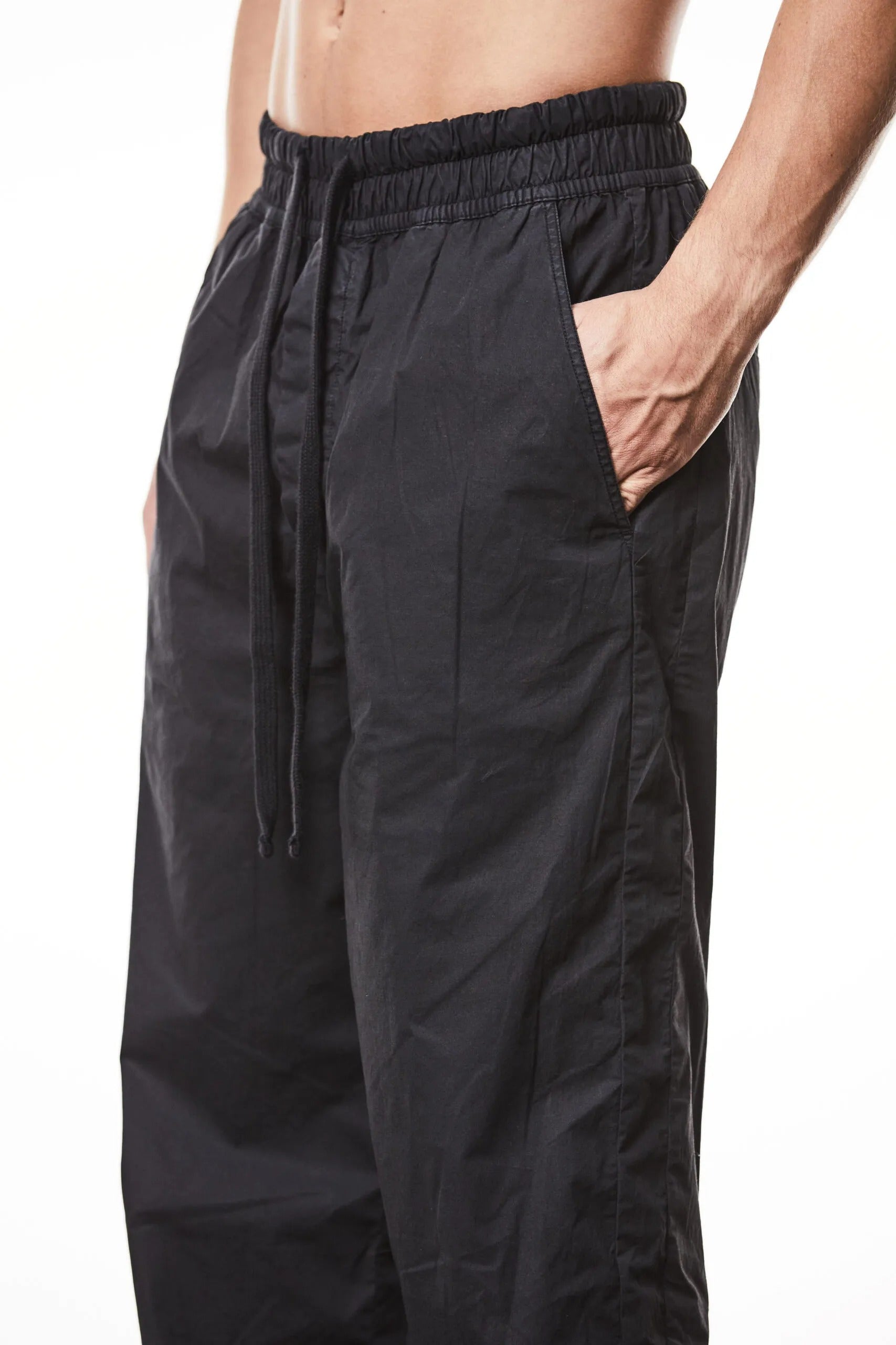 מכנסיים ארוכים בגזרה רחבה מבד ארוגמכנסי רגל רחבה עם מותן גמיש ושרוך קשירה, עשויים מבד כותנה מעובד למראה שטוף ומרוסק. כיסי גב כפולים – אחד עם דש ואחד עם פתיחה כפולה, כולל כיס פנימי נסתר לנוחות ובטיחות.