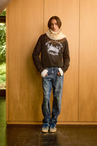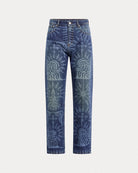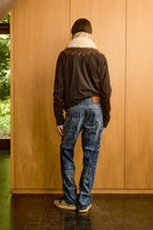 Straight-leg jeans with spiritual laser-etched motifs. Features a Bluemarble-branded calf pony hair jacron.