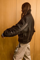 Boxy-fit bomber jacket in a black wool-nylon blend. Features a nylon collar, double pockets (zippered and hidden welt), and ribbed hems and cuffs.