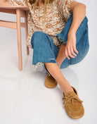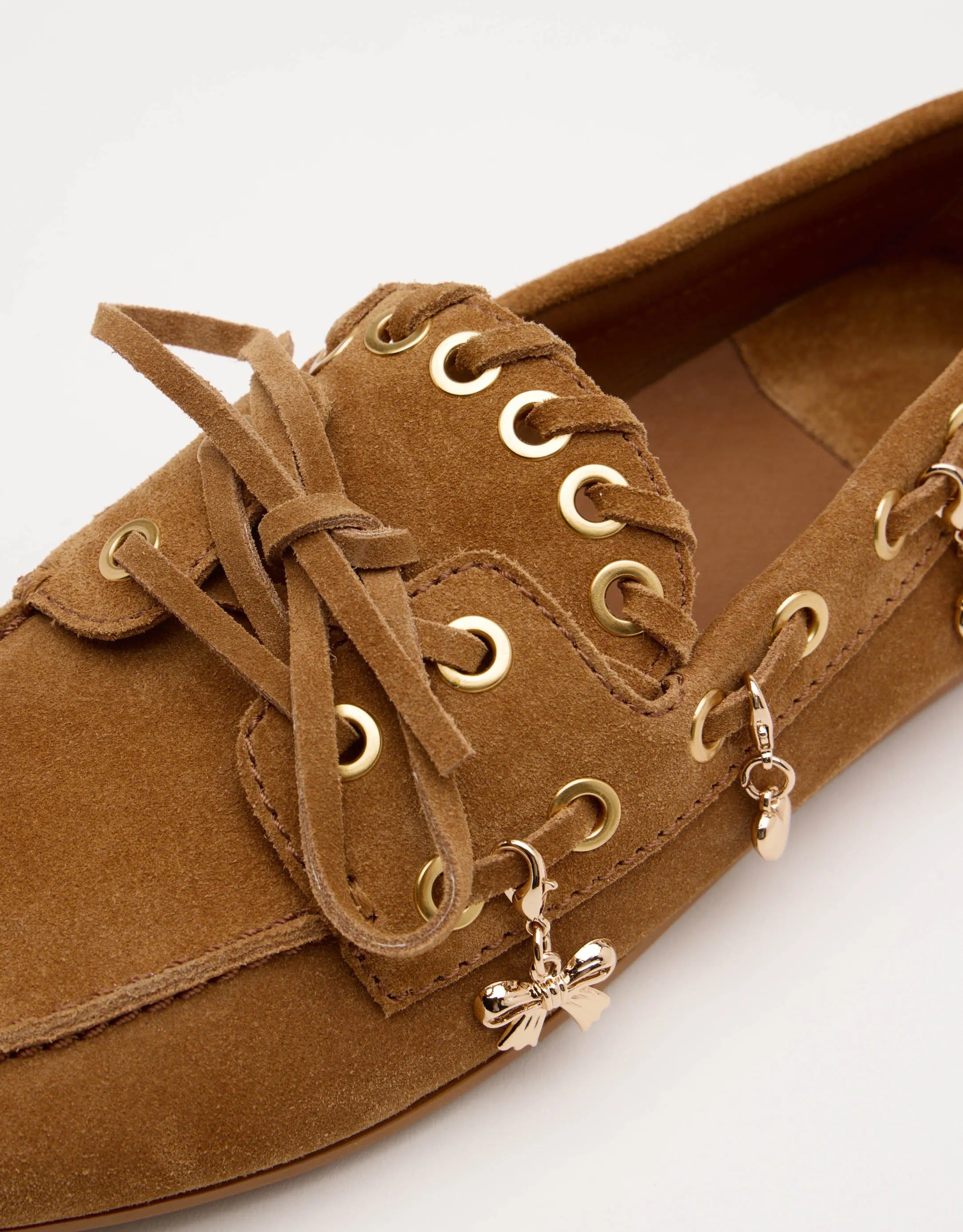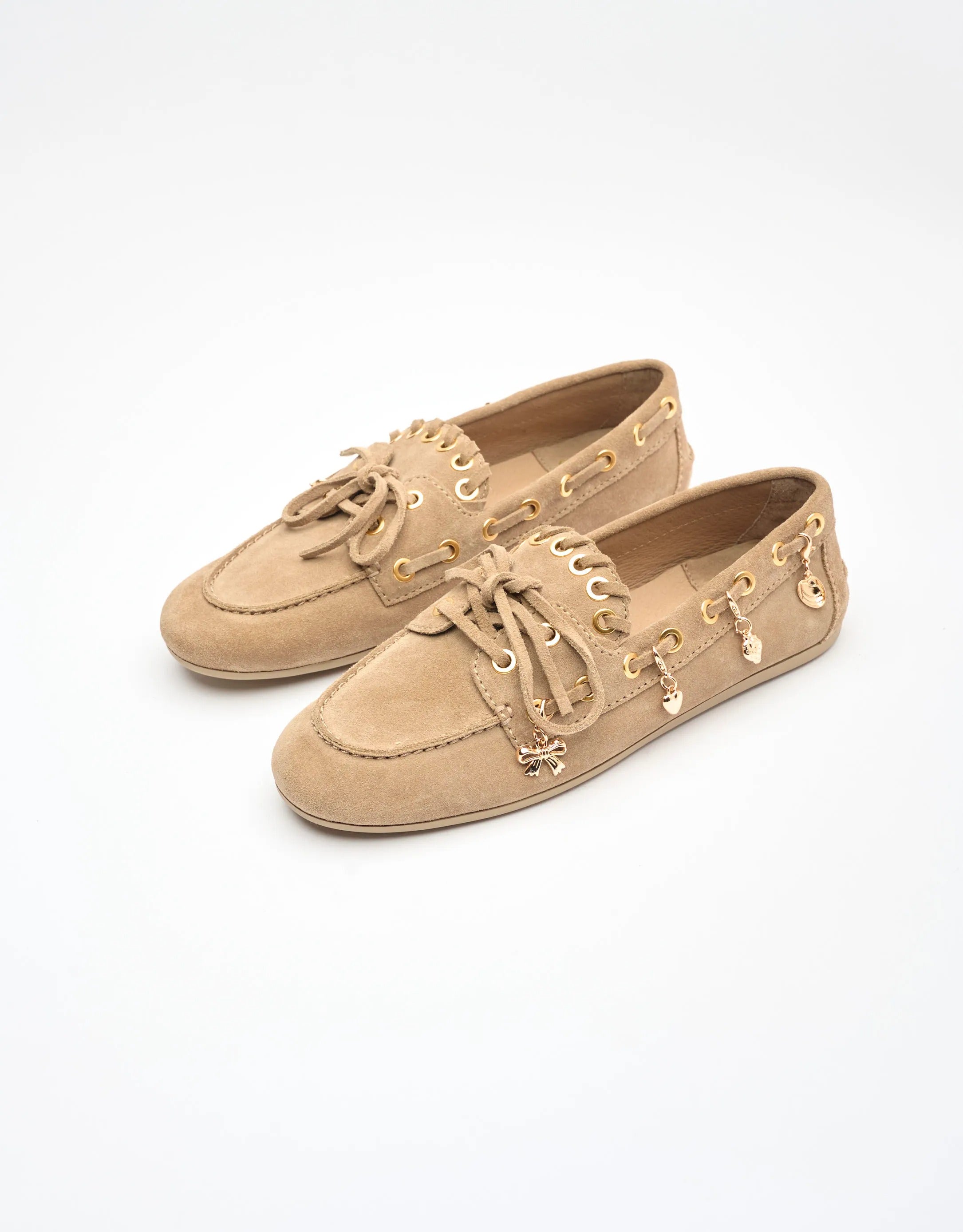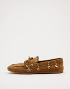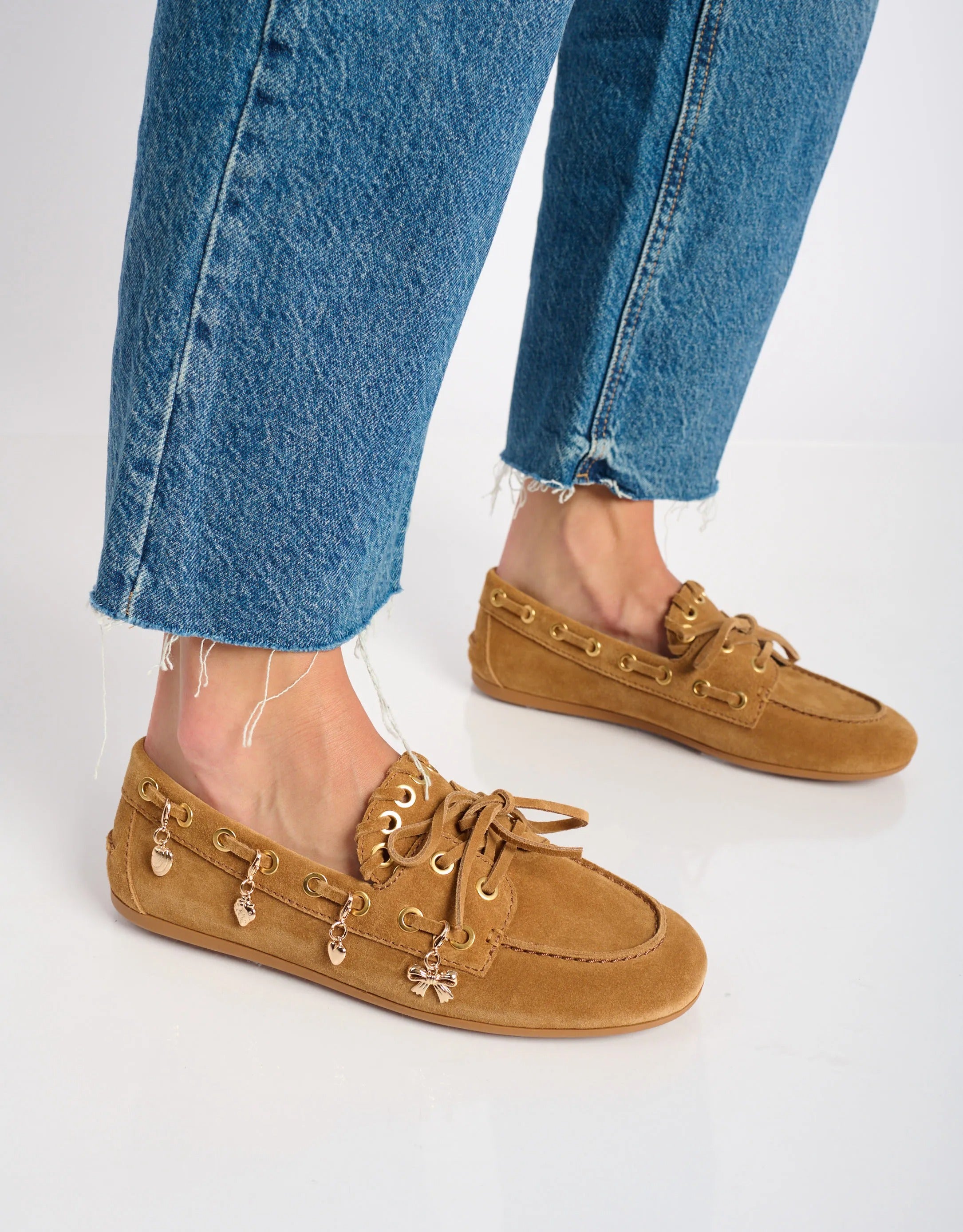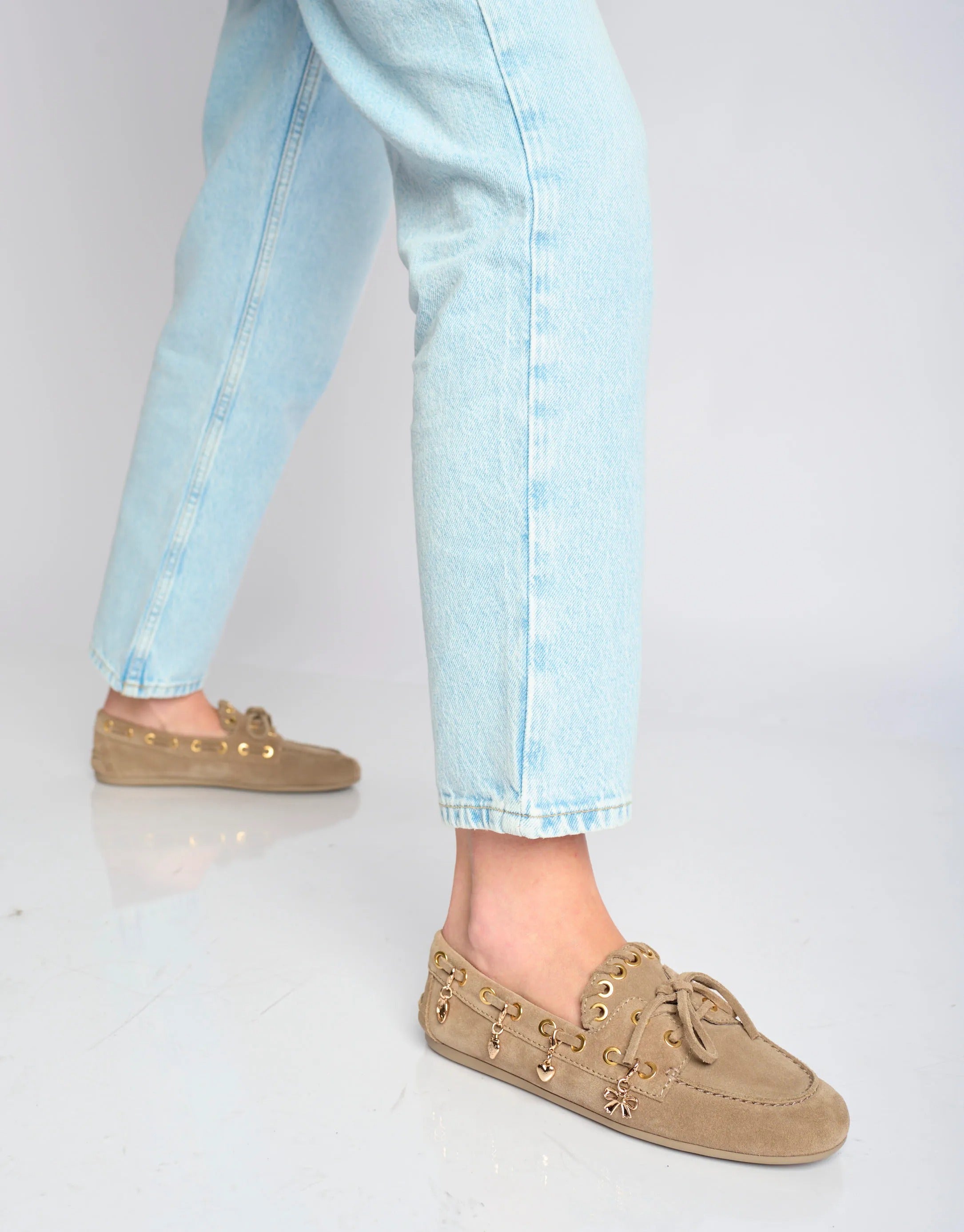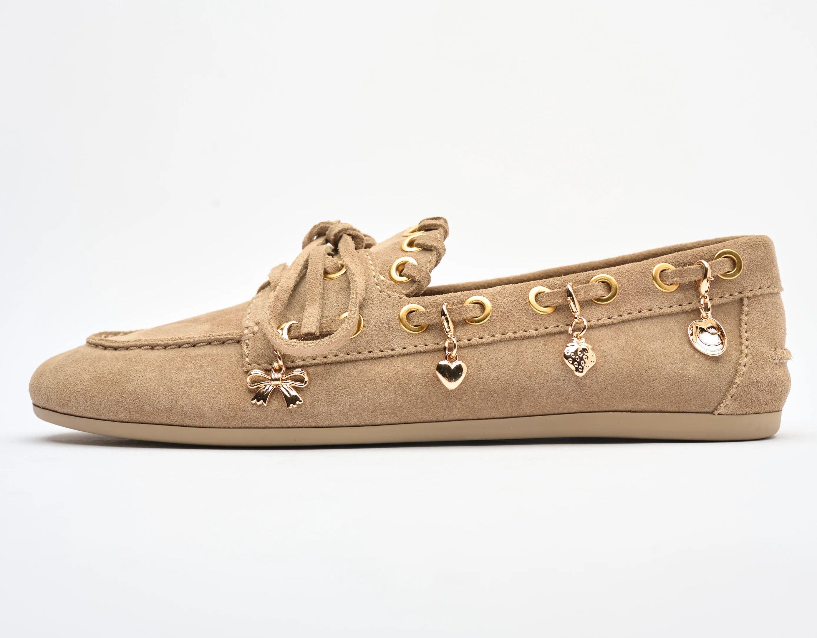 נעלי מוקסין שטוחות עשויות זמש, עם צ׳ארמס מטריפים. מאסט ליום יום.