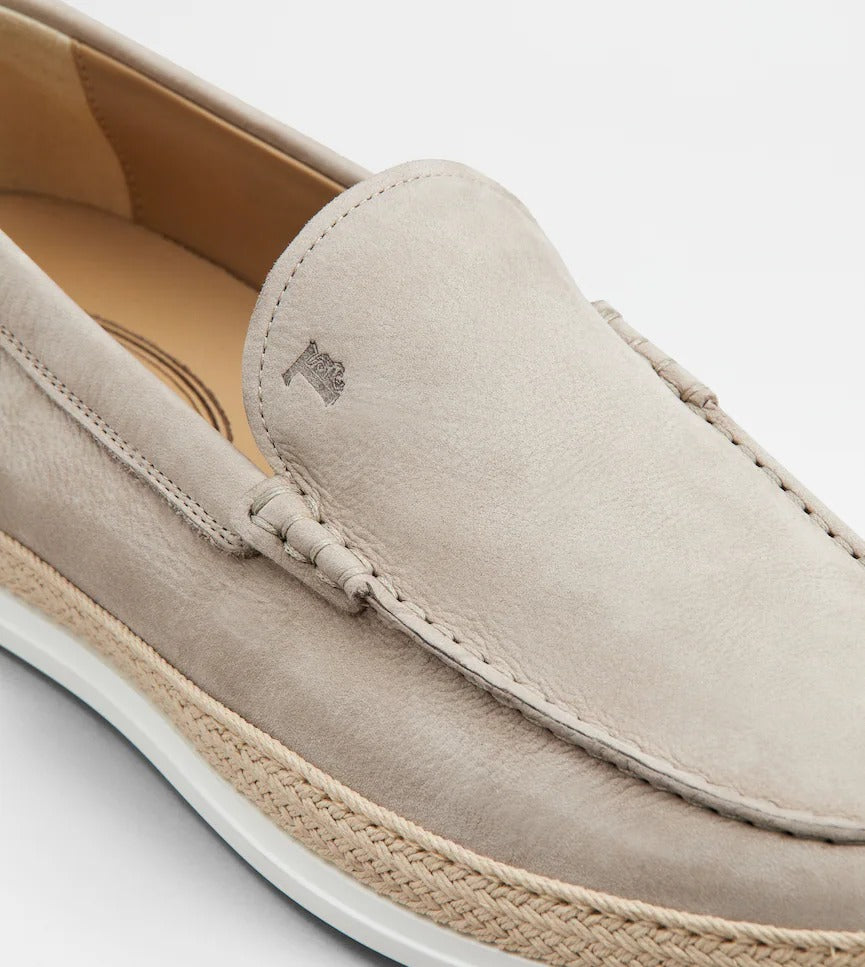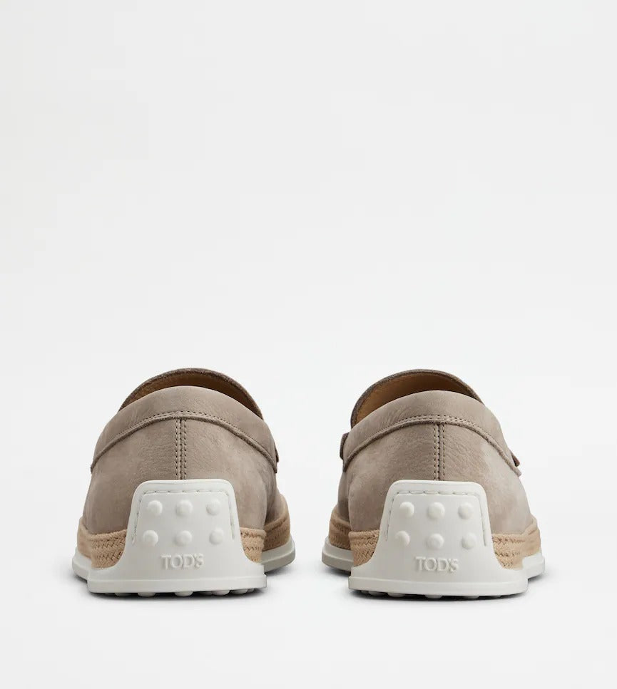 Slip-ons in silky nubuck with stamped Tod's monogram and exposed stitching. Rubber outsole with embossed rubber pebbles and handcrafted raffia weaving.