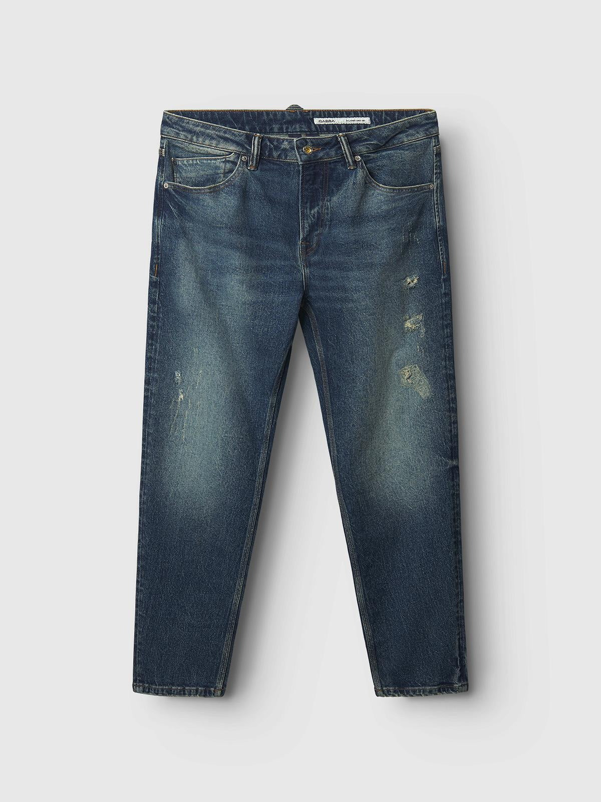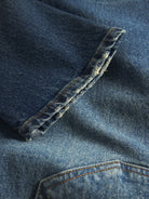 The dark blue denim wash with subtle worn details adds a rugged yet versatile style – perfect for everyday wear.