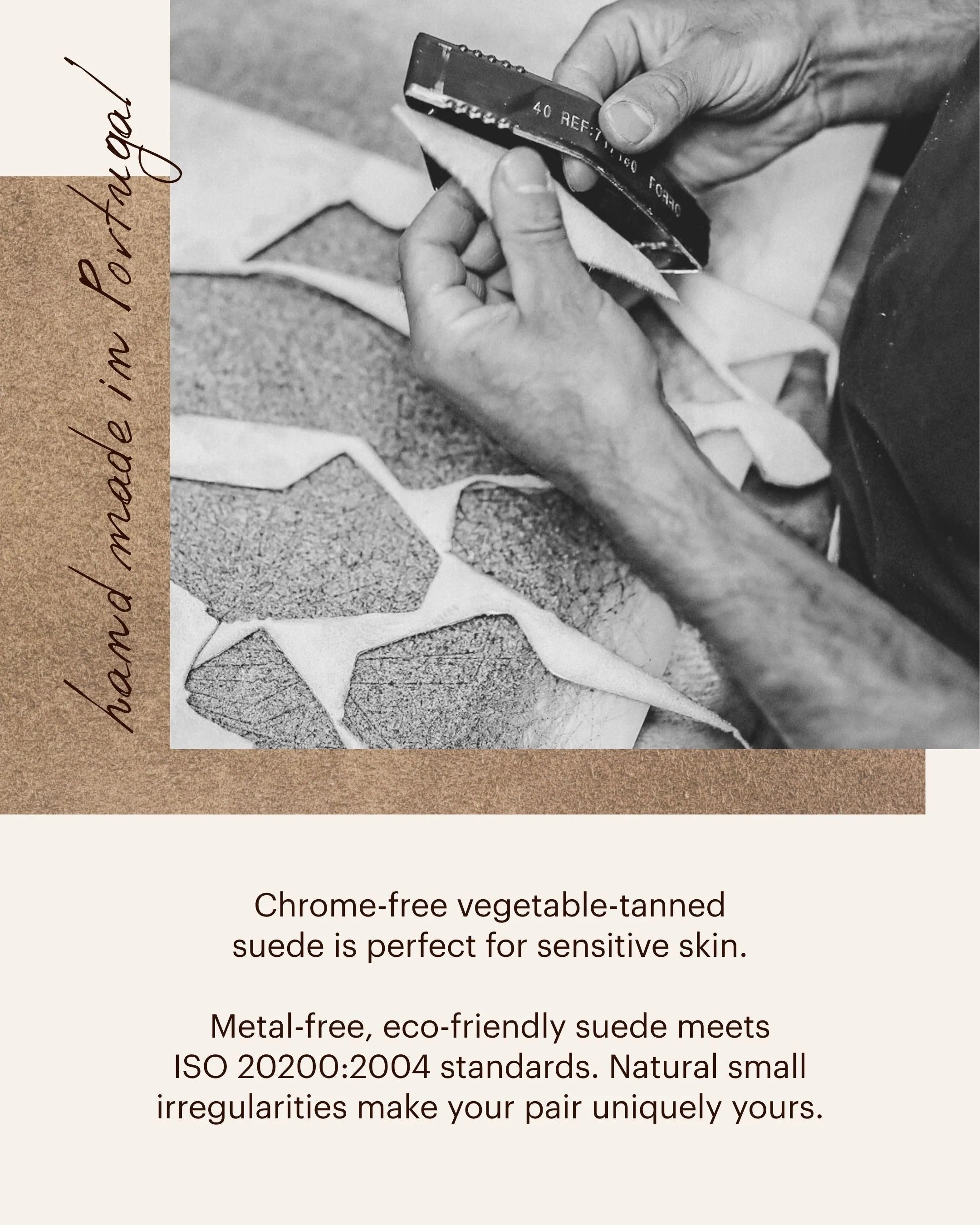 Upper: Premium, chrome-free vegetable-tanned suede from Portugal. Locally sourced materials support regional craftsmen.