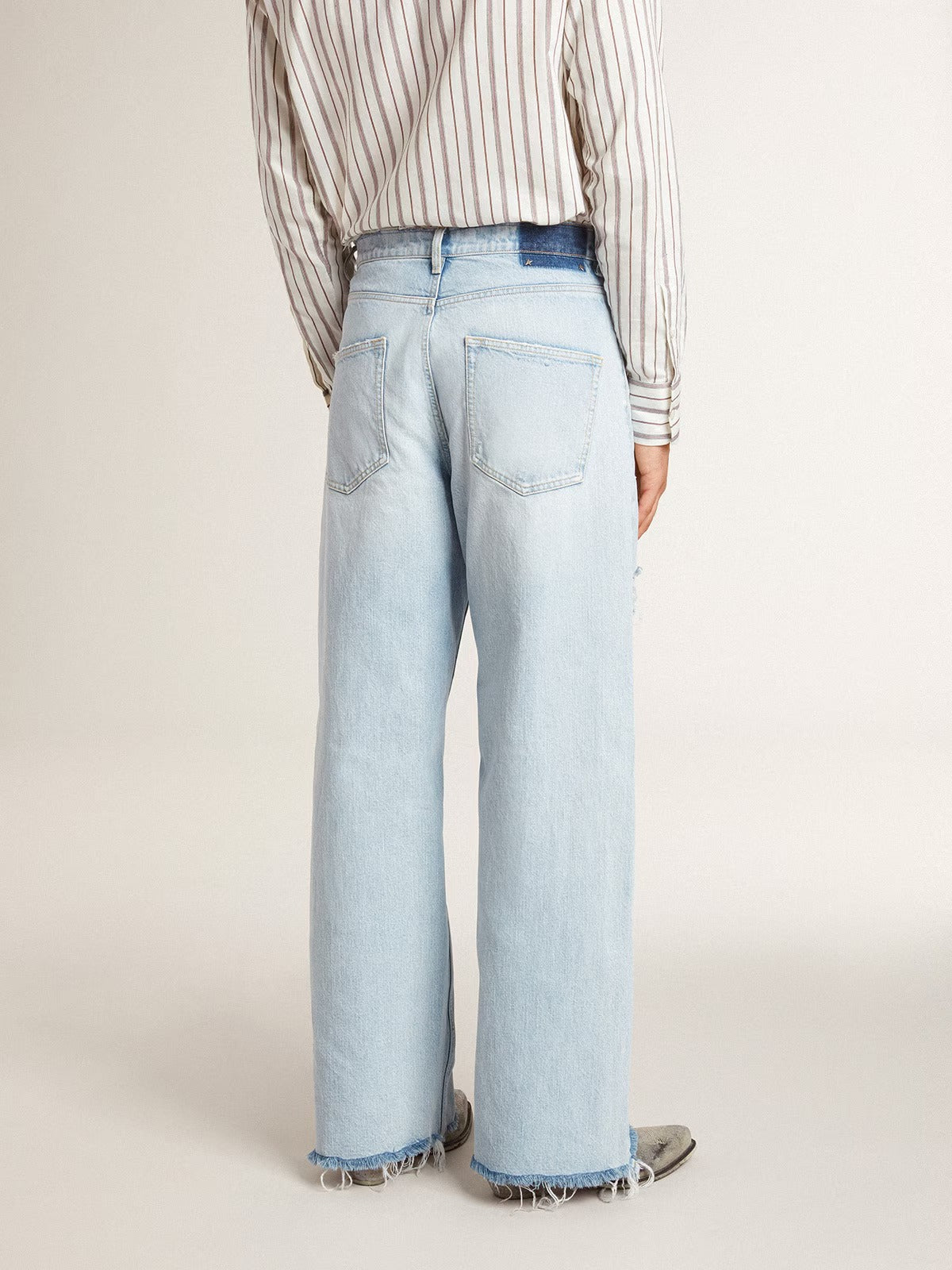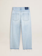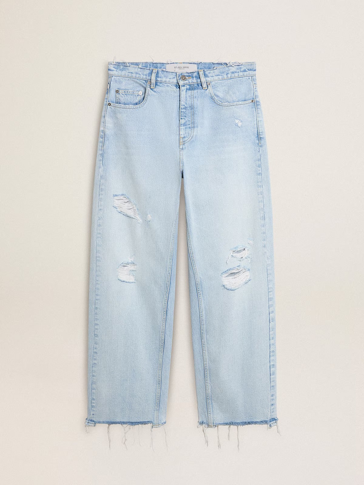 Inspired by the electric energy of the Nineties, the collection celebrates the limitless power of shared dreams. Moved by passion, each design captures the meaning of togetherness and the power of music. These denim pants with bleached dye have an oversized fit and rips that give a lived-in effect. The five pockets add the finishing touch.