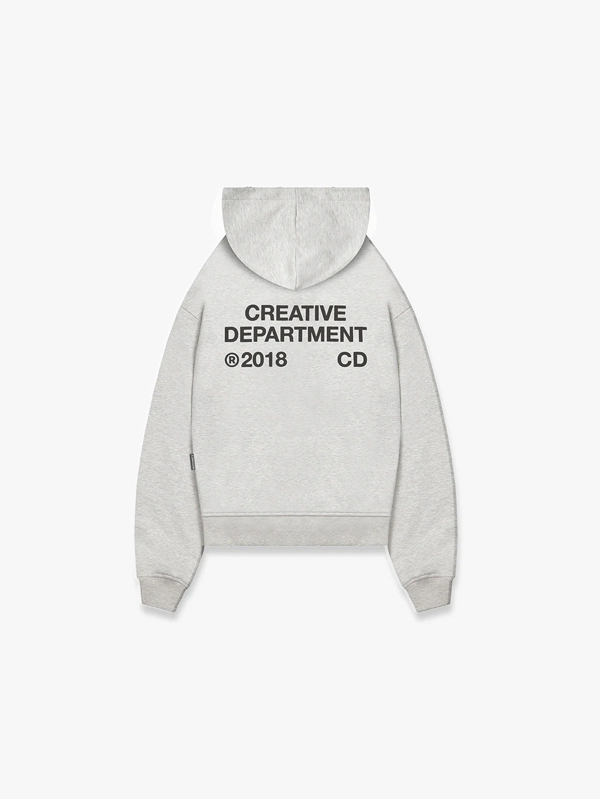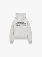 The Creative Department Hoodie, made of a soft melange fabric. Additionally, a white print on the chest & back as well as handmade destroyed effects add a touch of sophistication, made for Creative Department members.
