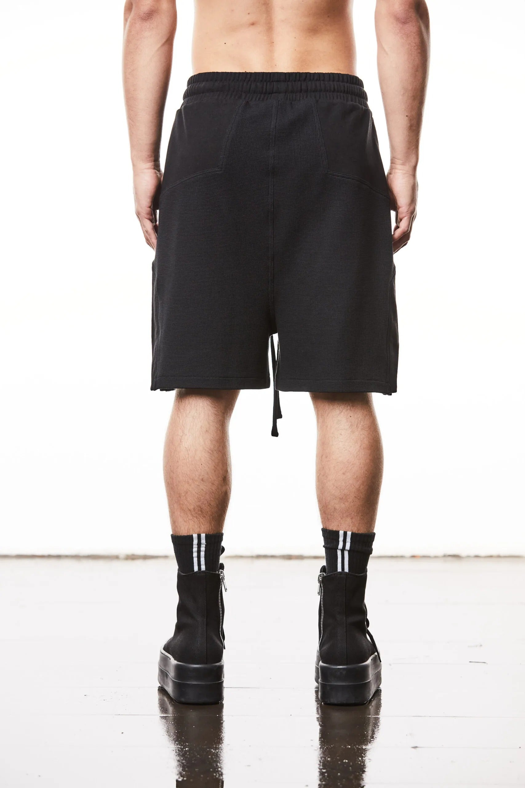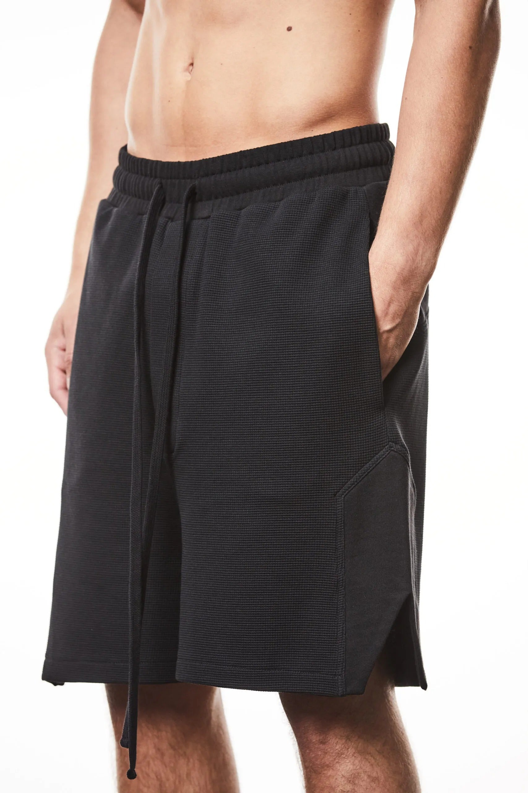 Soft jersey shorts with a tailored construction, combined with lightweight cotton fabric overlays for a sense of depth and a distinctive design. Elastic waist with drawstring and hidden inner pocket for safety and comfort.