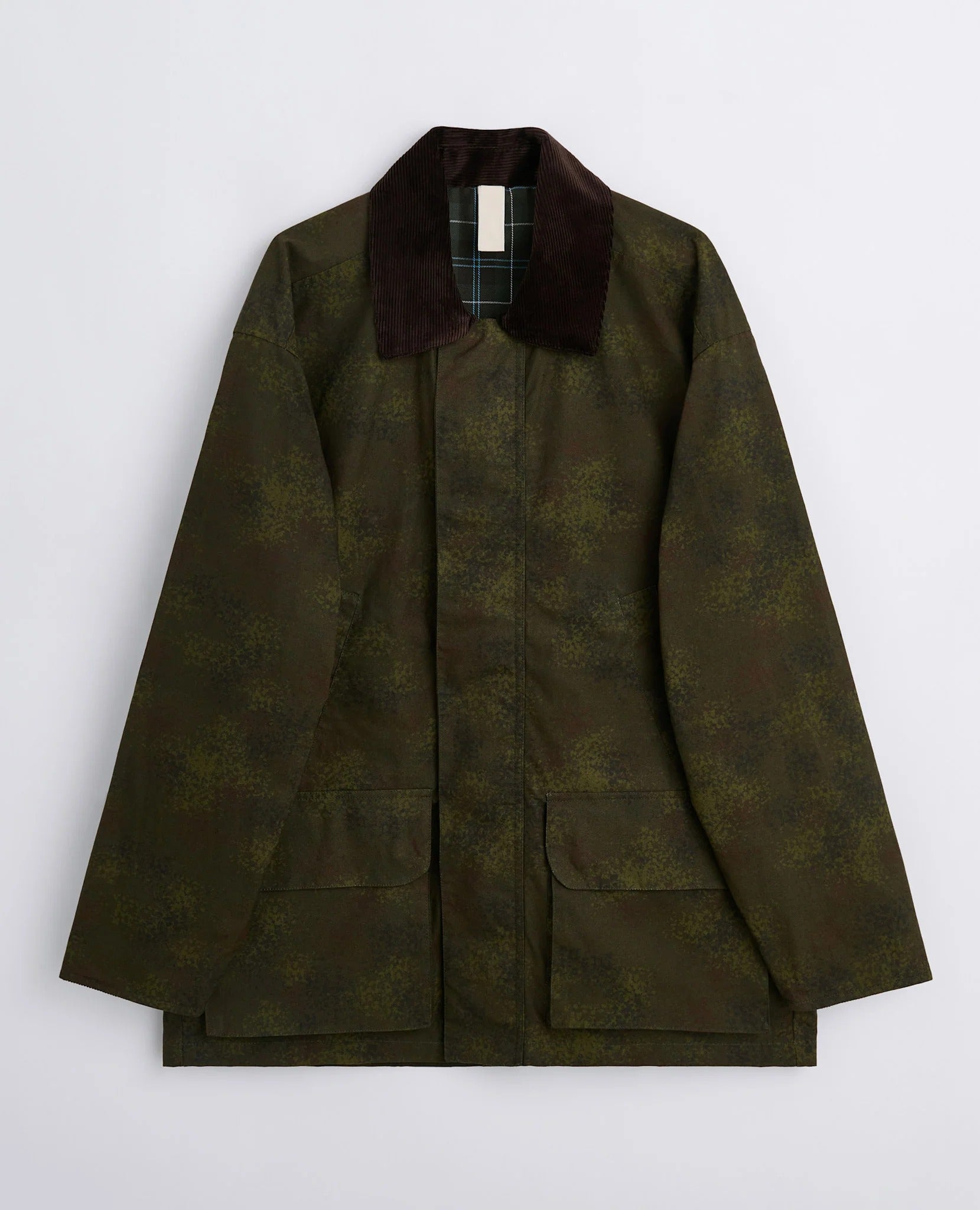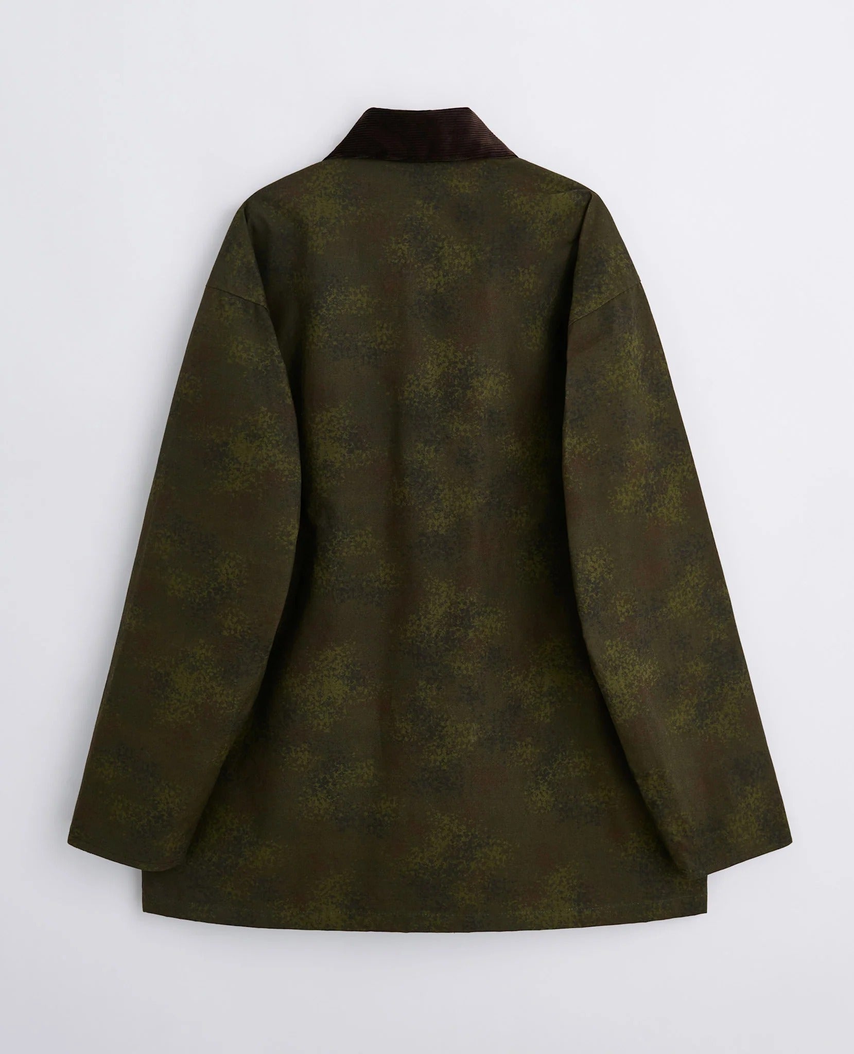 Leisure jacket made in the UK, camouflage printed fabric and contrast corduroy collar